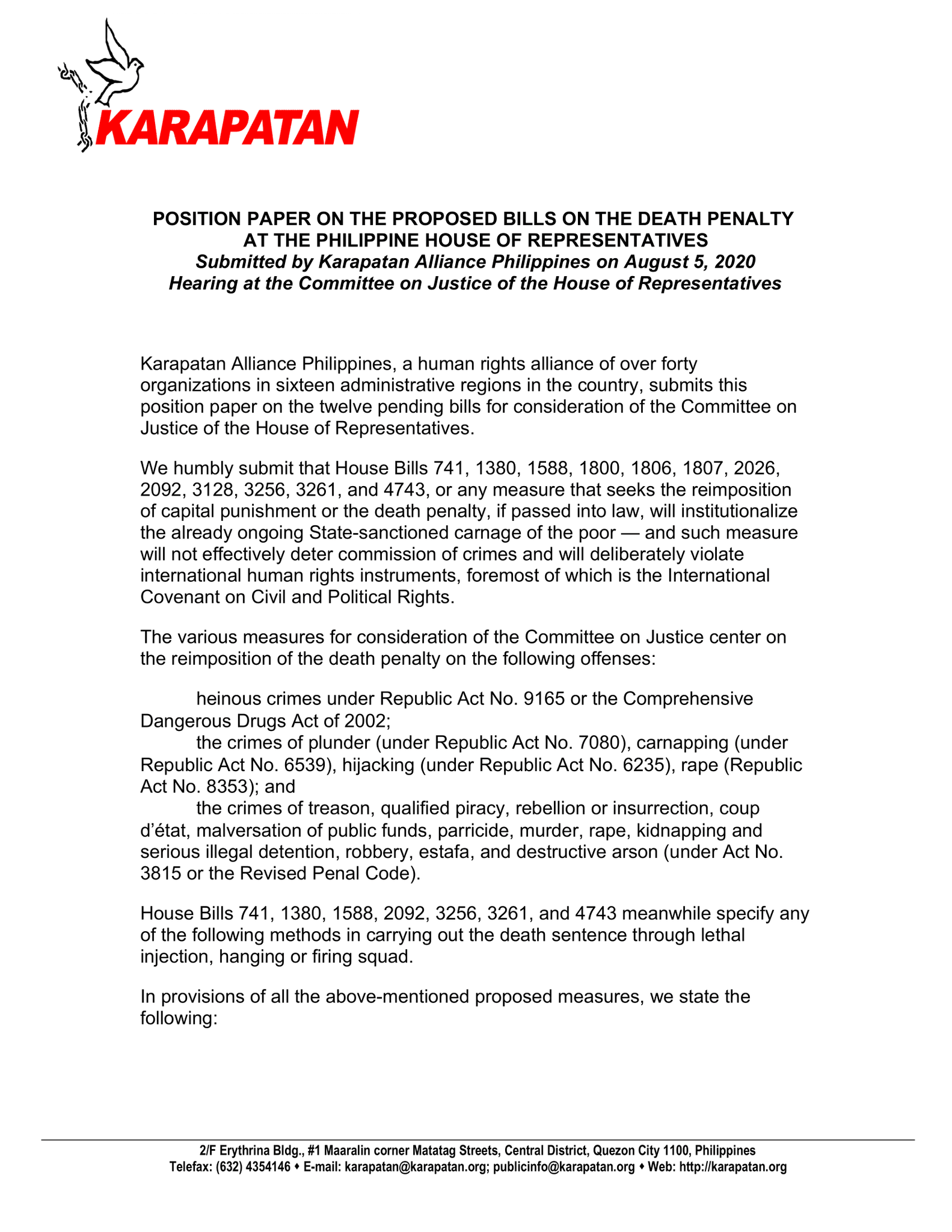 Philip Jamilla On Twitter Earlier Today Karapatan Submitted Its Position Paper Before The House Justice Committee Hearing On The Proposed Bills For The Reimposition Of Death Penalty Following President Rodrigo Duterte S Call